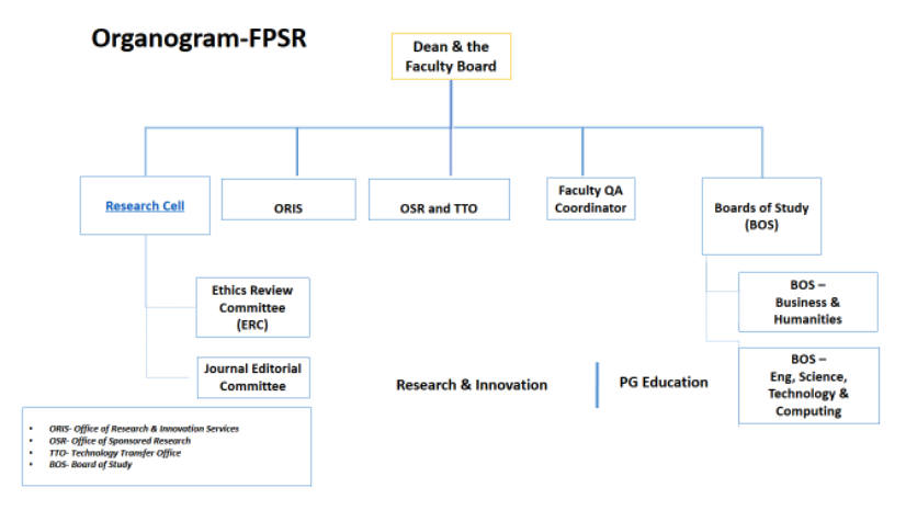 FPSR primarily oversees the Postgraduate Education and Research & Development in the institute. Postgraduate Education is managed by the Board of Studies and Research Activities are managed by the Research Cell.